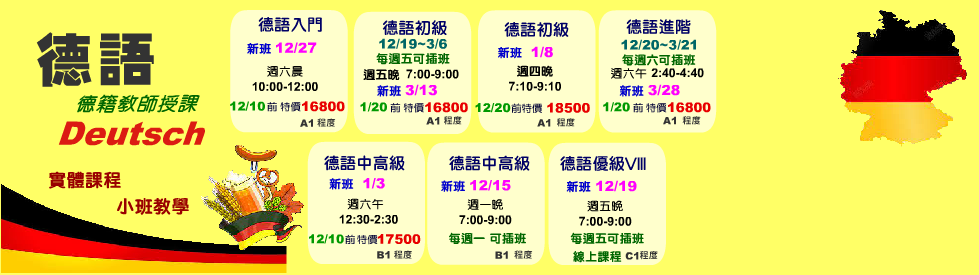 德語入門 12/27 週六晨 10:00-12:00 德籍教師 Gunther【12/10前 特價16800元】