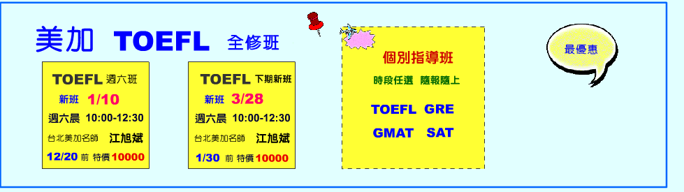 TOEFL週六班 1/10 週六晨10:00-12:30 美加名師 江旭斌【12/20前 特價10000元】