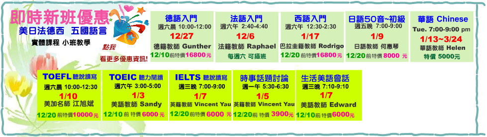 TOEIC聽力閱讀 1/3 週六午 3:00-5:00 美語教師 Sandy【12/10前 特價6000元】