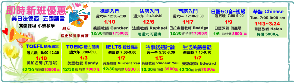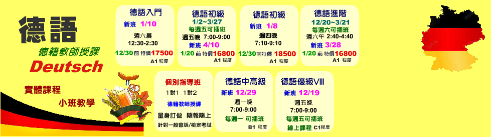 德語入門 1/10 週六午 12:30-2:30 德籍教師 Gunther【12/30前 特價17500元】