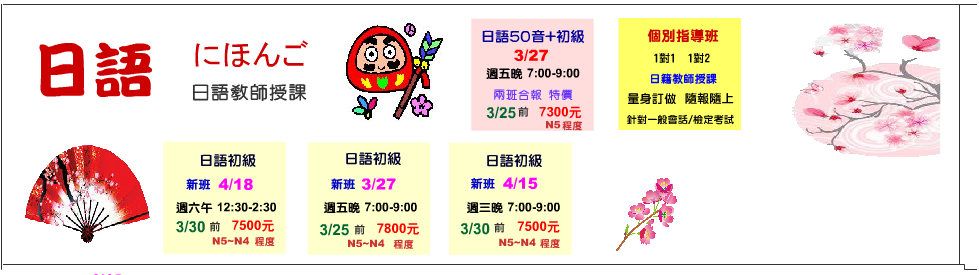 日語50音~初級I 3/27 週五晚 7:00-9:00 日語教師 何惠琴【3/25前 特價7300元】