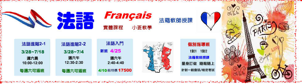 法語入門 4/25 週六午 2:40~4:40 法籍教師 Raphael【4/10前 特價17500元】