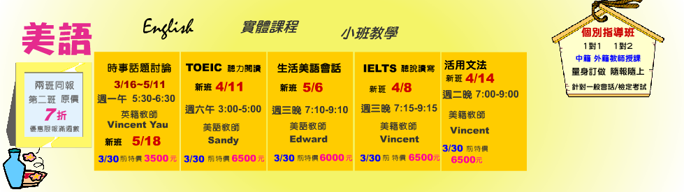 IELTS聽說讀寫 4/8 週三晚 7:15-9:15 美籍教師 Vincent 【3/30前 特價6500元】