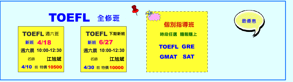 TOEFL週六班 4/18 週六晨10:00-12:30 資深名師 江旭斌【4/10前 特價10500元】