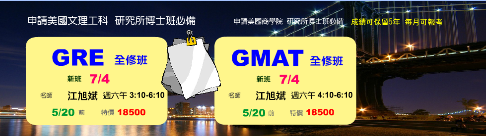 GRE週六班 7/4 週六午3:10-6:10 資深名師 江旭斌【5/20前 特價18500元】