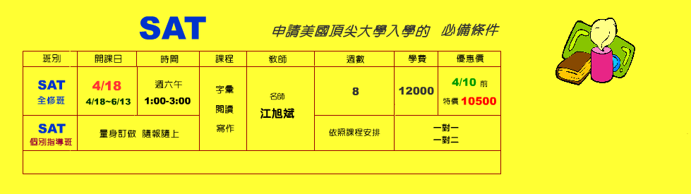 SAT 4/18 週六午1:00-3:00 資深名師 江旭斌【4/10前 特價10500元】