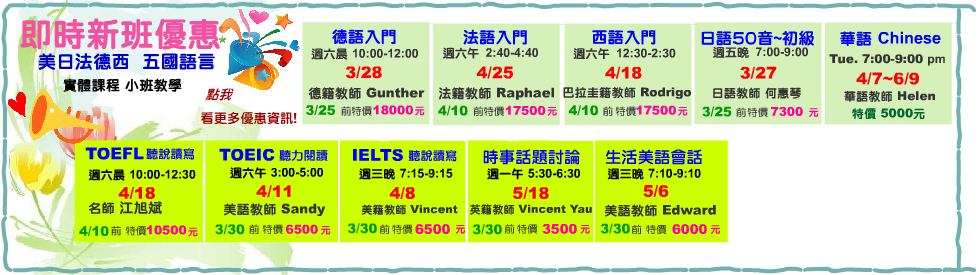 TOEIC聽力閱讀 4/11 週六午 3:00-5:00 美語教師 Sandy【3/30前 特價6500元】